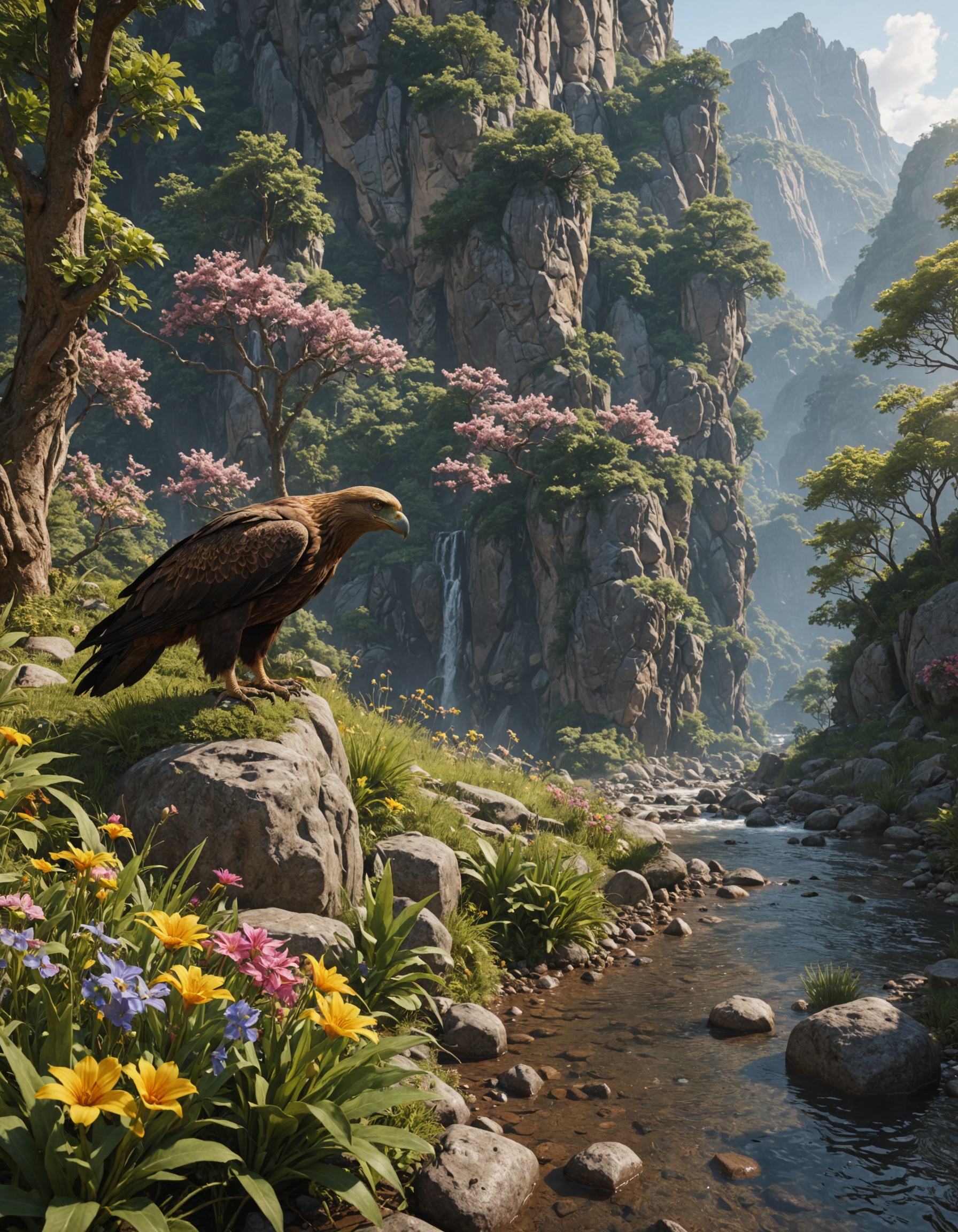 what did the people of the golden eagle family do in the chaoge mountains?,, unreal engine 5 render,jungle,river,flowers,extremely detailed,colorful,