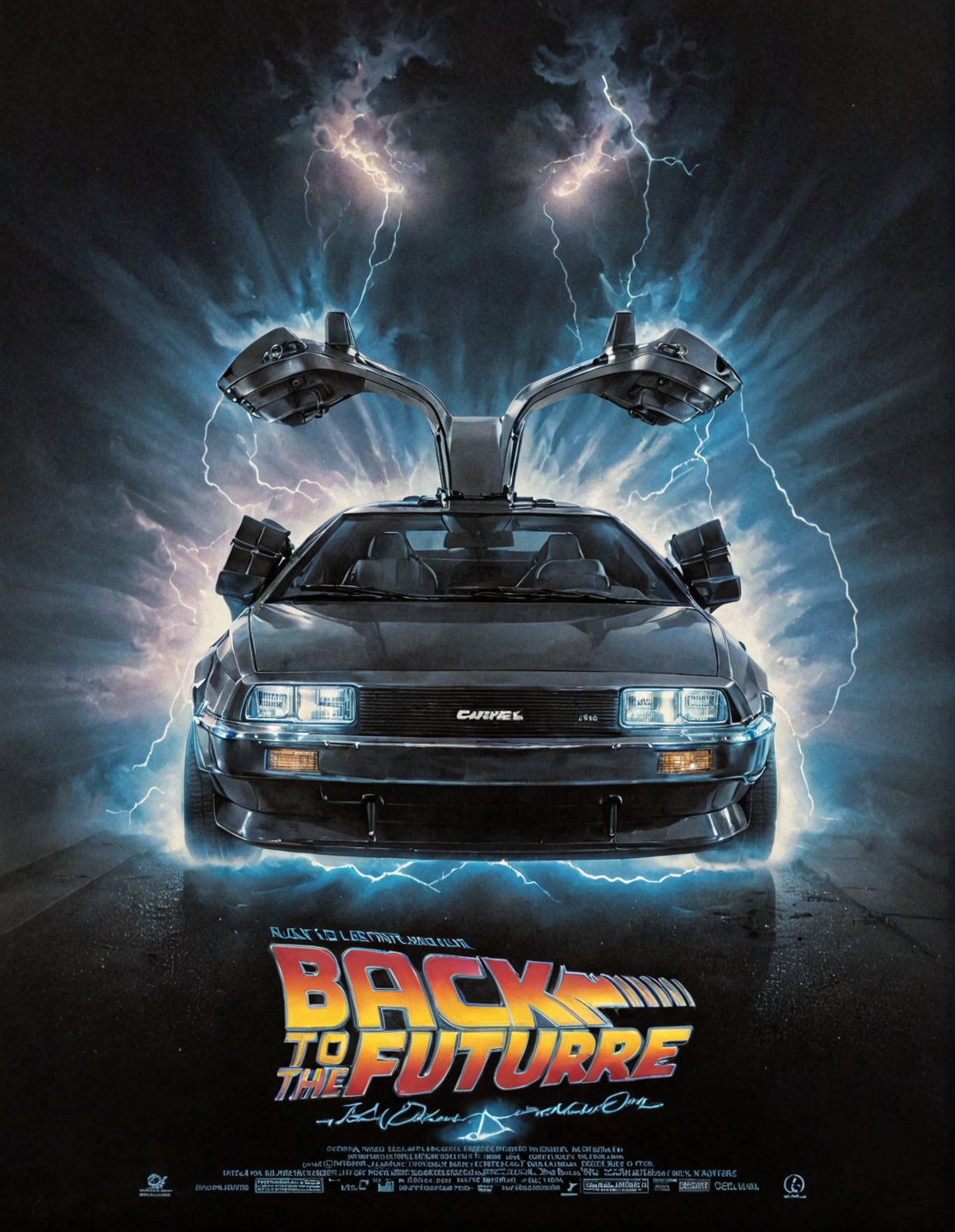 cinexart (title "Back to the Future") futuristic car, time machine, <lora:cinexart:1> cinexart, movie poster