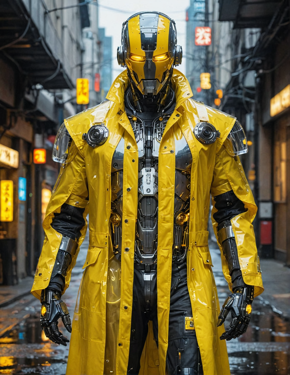A cyberpunk robot wearing a transparent yellow mackintosh, glowing elements, masterpiece, best quality,