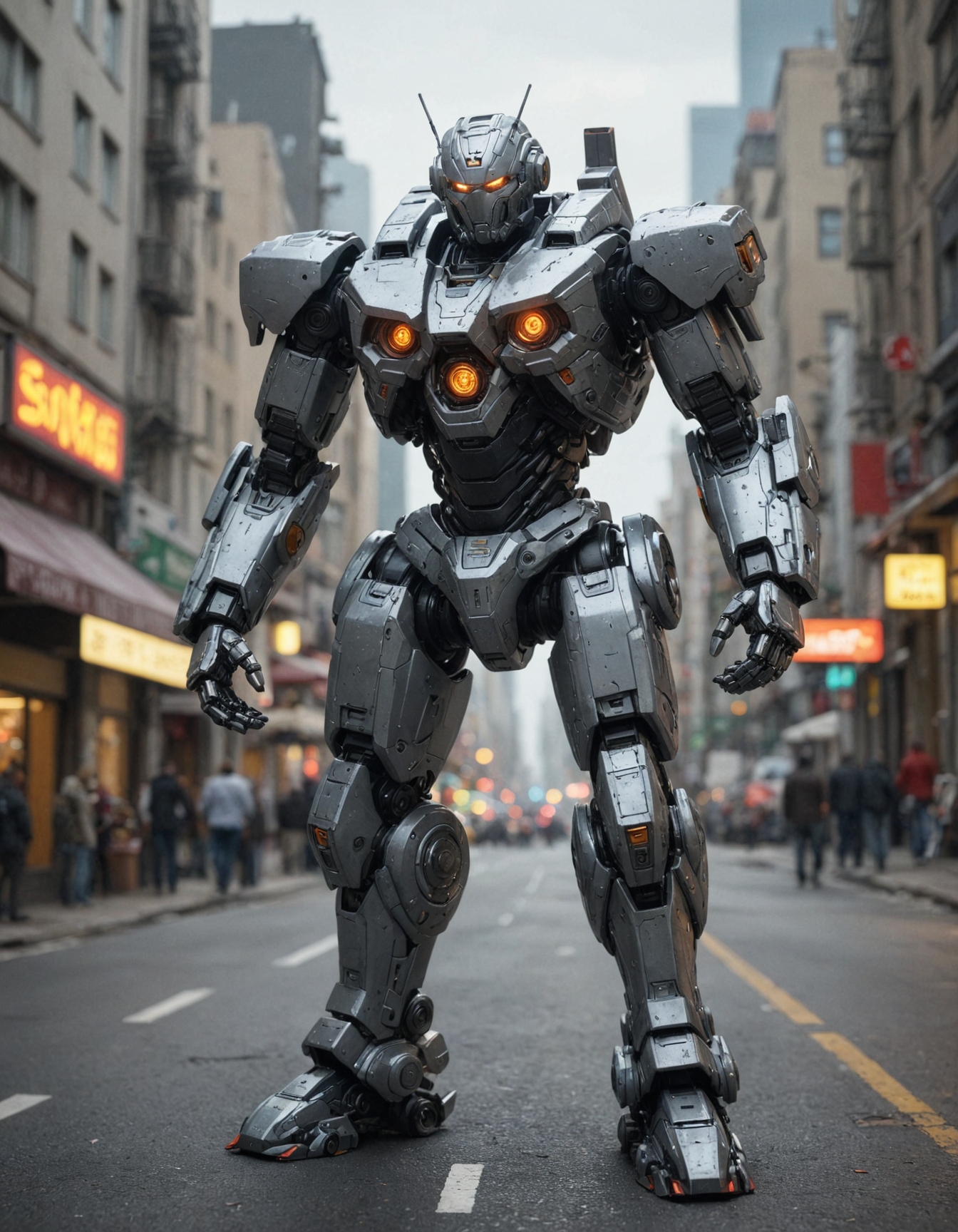 cgi, high quality render of mecha robot, perfect environment, city, sci-fi, extremely detailed, dof, bokeh