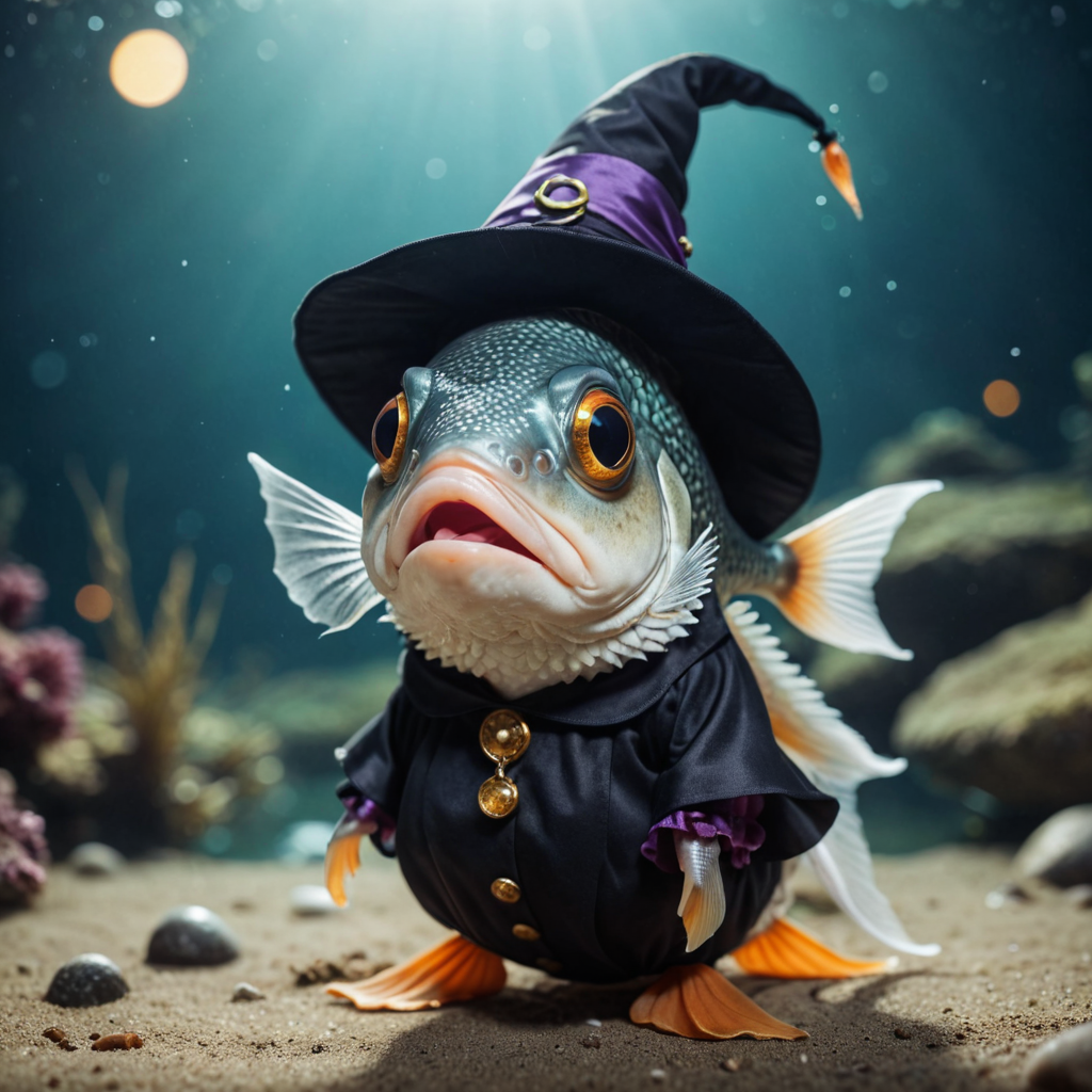 cinematic film still a fish wearing a witch outfit , cute and adorable, . shallow depth of field, vignette, highly detailed, high budget, bokeh, cinemascope, moody, epic, gorgeous, film grain, grainy