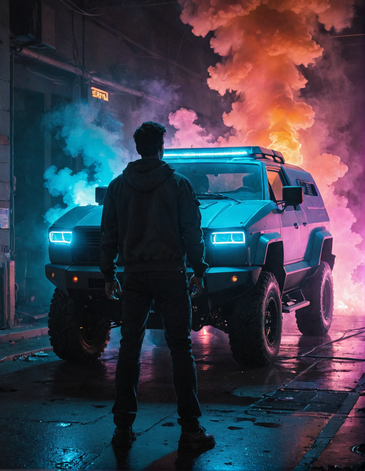 masterpiece, best quality, a cybertruck, Neon, Smoke, Volume Lights, A man standing,