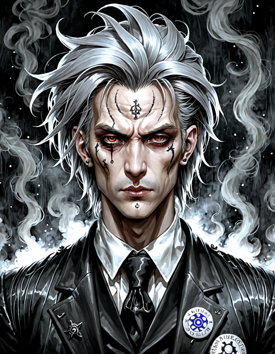 Brocore, mist, highborn Man, 🥳, Chemist, his hair is Award-Winning, Guillaume Sorel, Darkpunk, portrait art by Ayami Kojima
