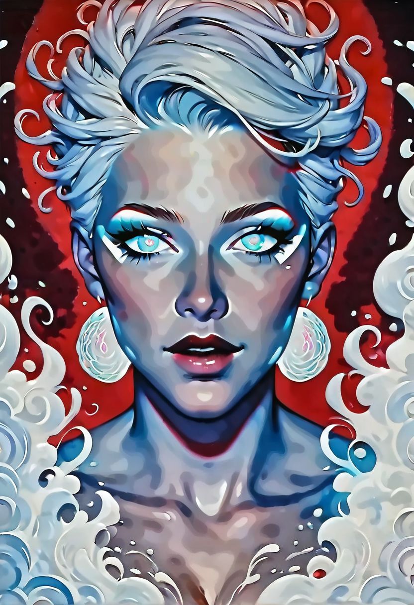 Face photo, official art, red background, flat color, partially colored, visuals intricate, highly detailed, breathtaking beauty, vibrant, Aestheticism Painting, A mature face,sideways glance,watery eyes,