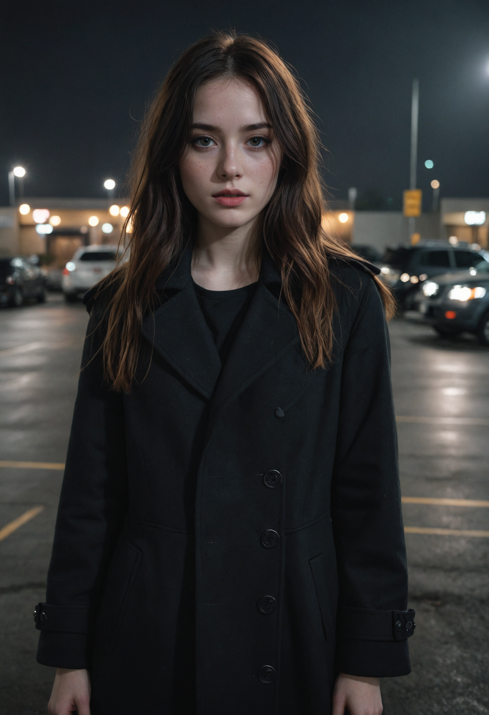 a young woman, medium full shot, looking at viewer, standing in a parking lot, makeup, realistic skin texture, (freckles:0.9), black coat, pale skin, beautiful woman, cute, long hair, black hair, brown eyes, expressionless, (dark theme:1.3), (dark lighting:1.3), night, mist,