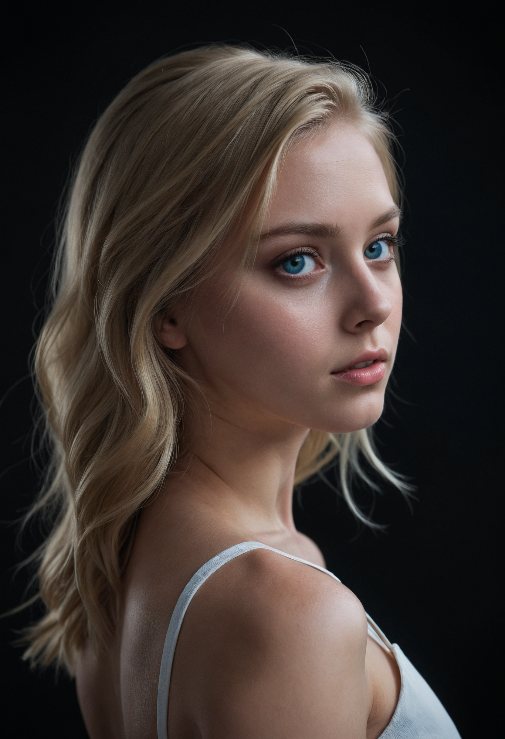 young woman with blond hair and blue eyes, pretty woman, portrait, from back side, looking away, staring into space, dark theme, dark background, skin details, raw photo, realistic,