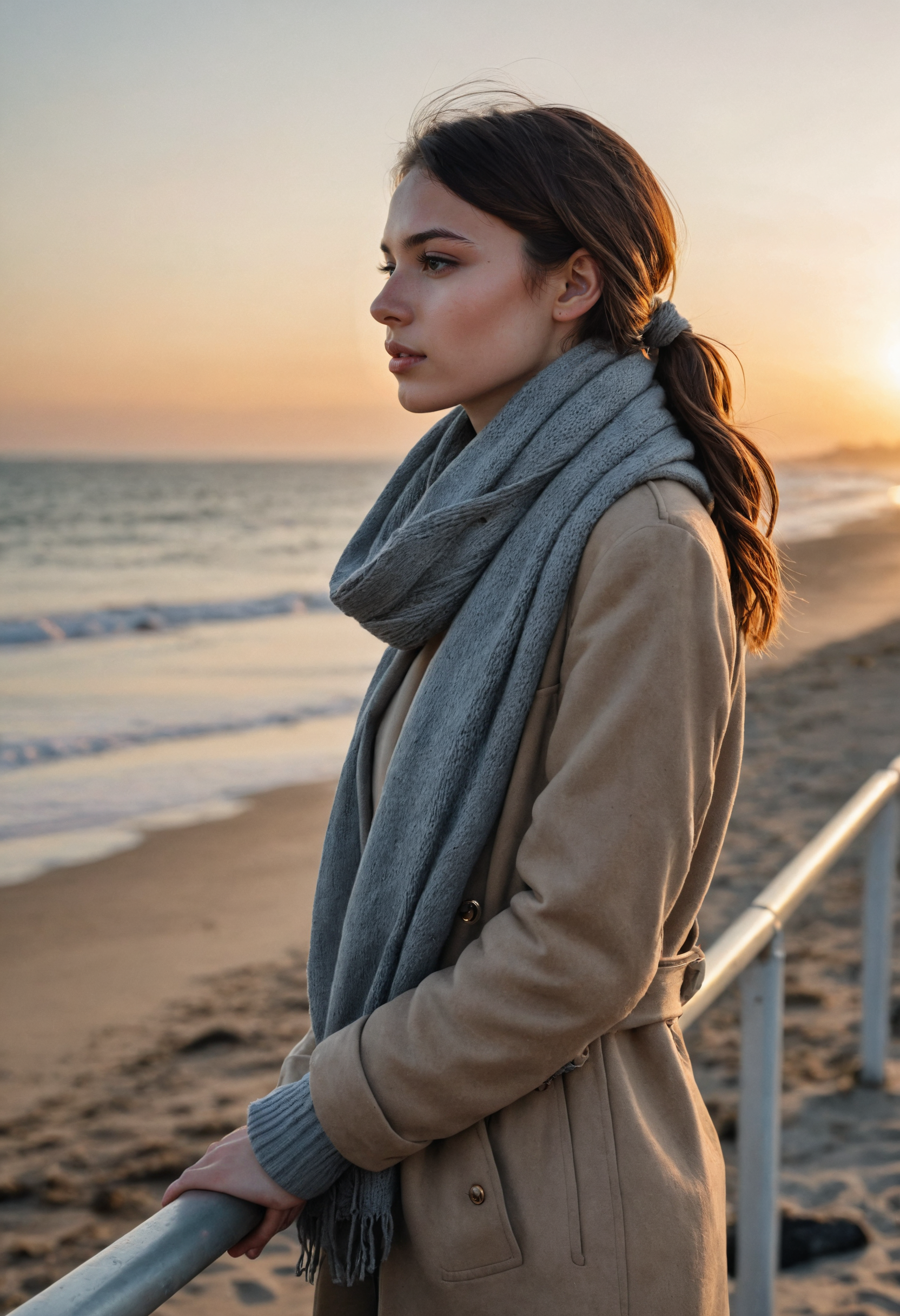 young woman leaning on a barrier, from side, beach, cold, morning, sunrise, looking away, stare into space, cap, scarf, coat, medium full shot, realistic, raw photo, skin details,