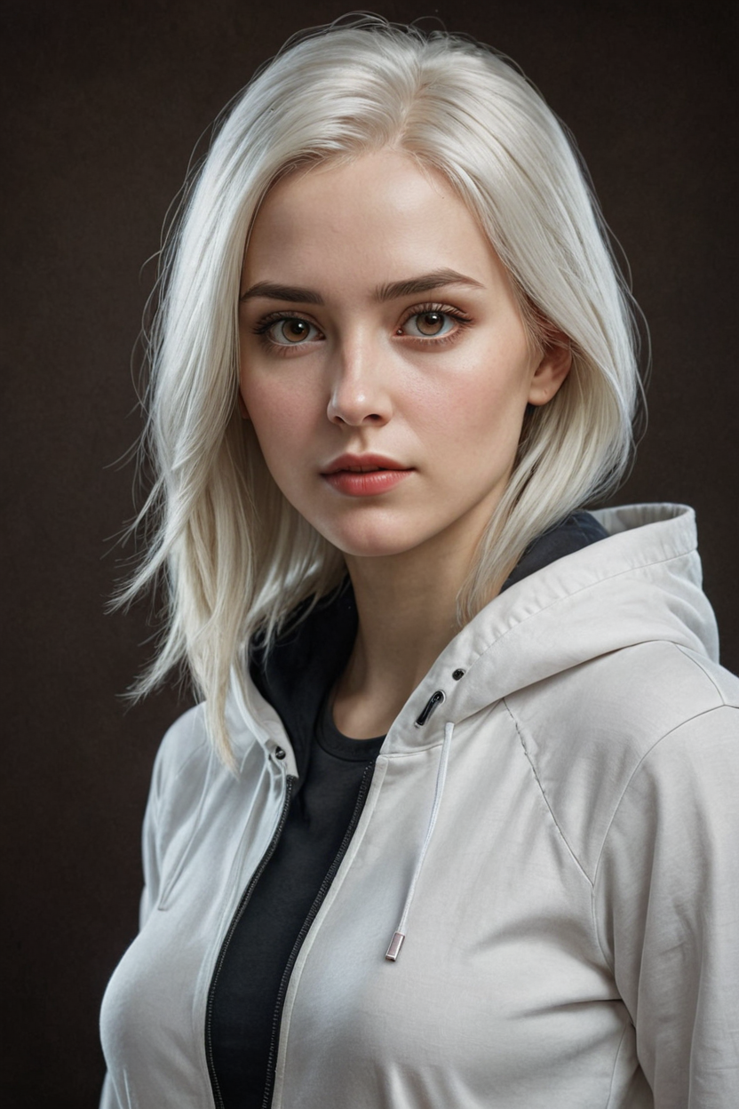 Hyperrealistic art beautiful hacker woman with medium white hair,pale skin,big brown eyes,slim face,epiCRealism,full body, . Extremely high-resolution details, photographic, realism pushed to extreme, fine texture, incredibly lifelike