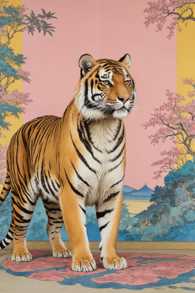 (Hollywood Regency Glamour by Cedric Gibbons), (best quality, masterpiece, official art:1.2), (Pen and Ink Drawing:1.2), tiger, outlines, stencil, detailed, yellow_pink_blue, side stance, wild, colored, full frame wall in the background in the style of Hokusai