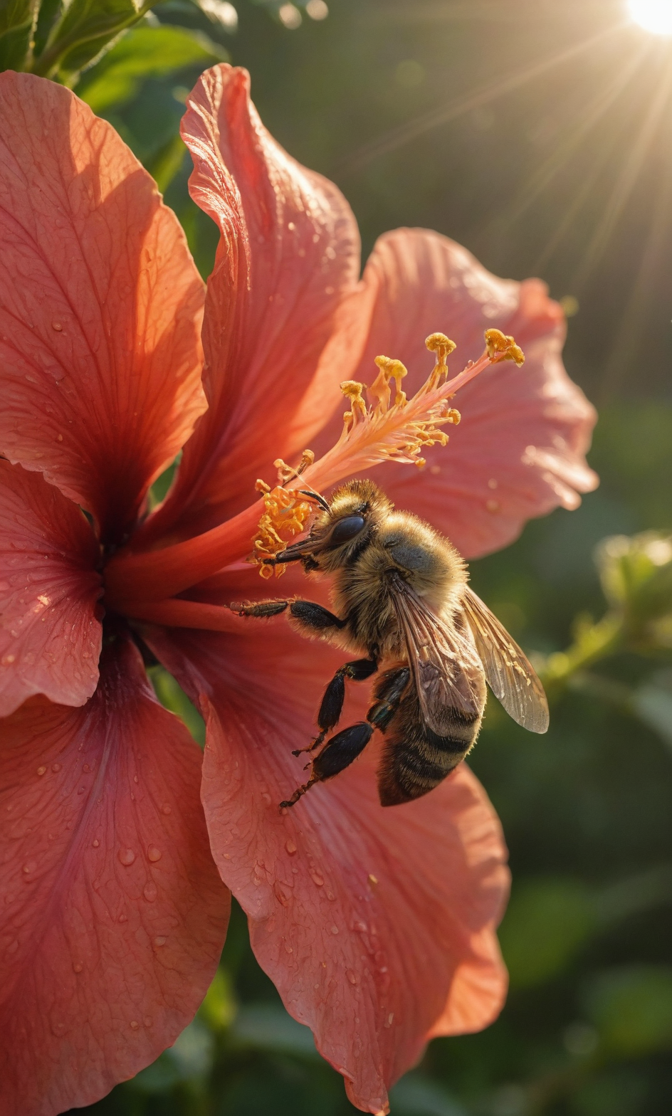 macro photography, bee, (pollen), red hibiscus, morning dew, golden hour, light rays, <lora:add-detail-xl:1>