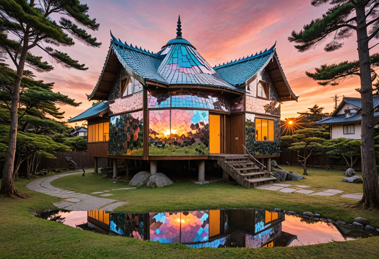 A japanese ancient whimsical house constructed entirely from oversized, shimmering compact discs, reflecting a kaleidoscopic sunset