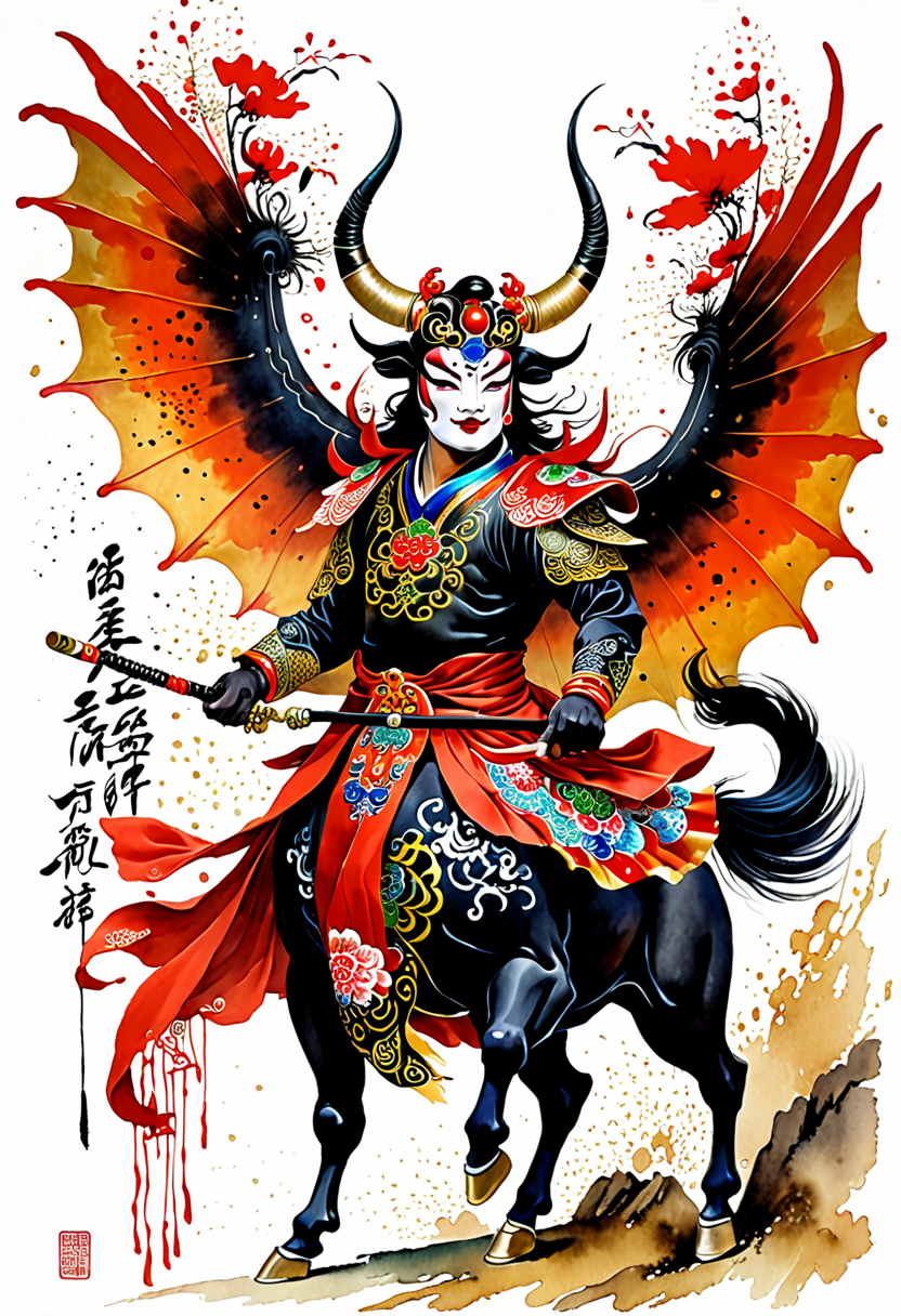 ((masterpiece)),best quality,((illustration)),original,extremely detailed wallpaper,(((beijing opera))),(sketch),((wash painting)),((ink splashing)),((((dyeing)))),((Chinese painting)),((beijing opera))),(sketch),(wash painting),(ink splashing),dyeing,((Chinese painting)),((a mythical ferocious animal)),{{The bull}},{{ long horns}},{{With wings on its back}},(Red and black wings),(solo),mountain,Big and strong,Diabolical,Tyrannical,