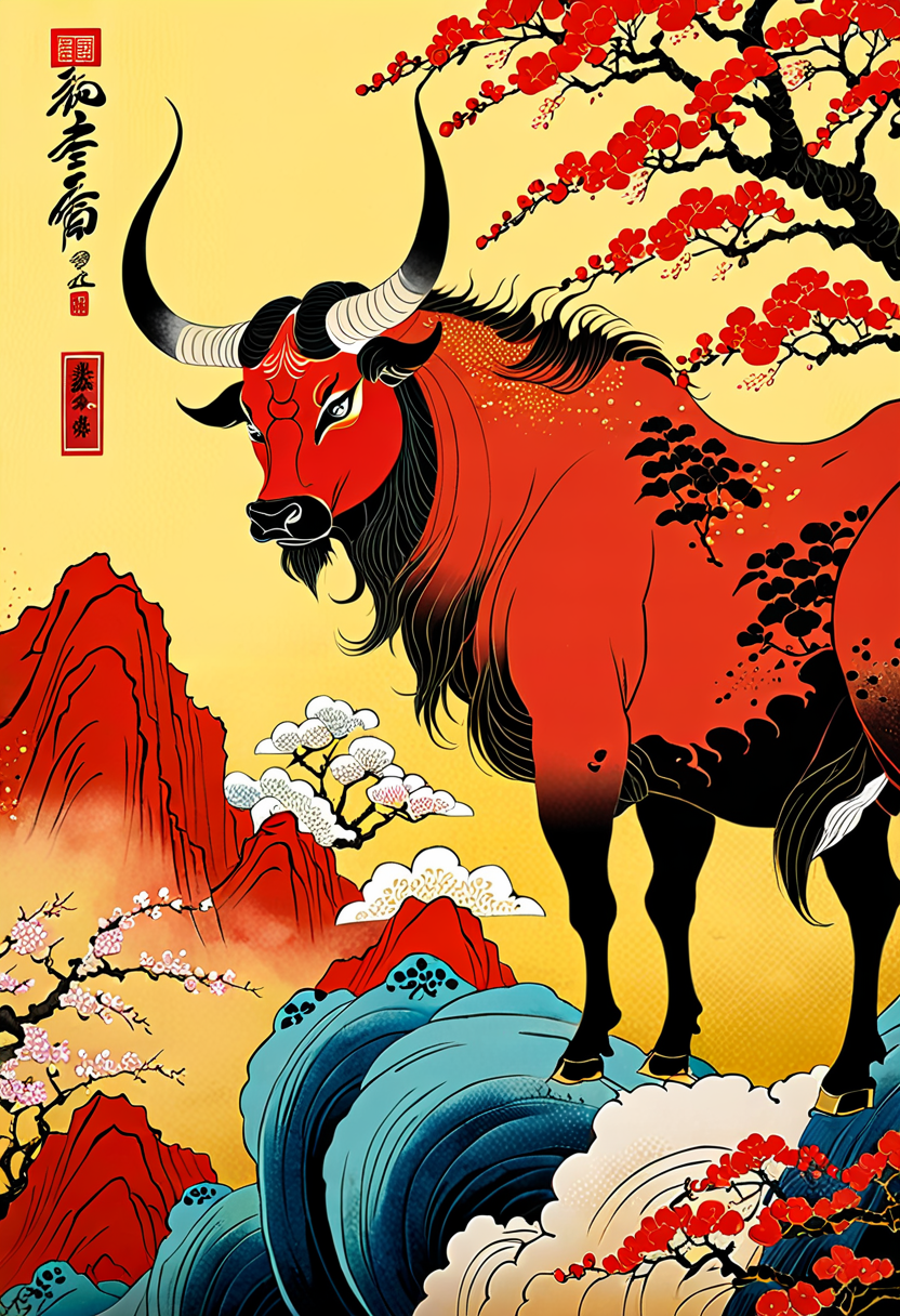 ((masterpiece)),best quality,((illustration)),original,extremely detailed wallpaper,(((beijing opera))),(sketch),((wash painting)),((ink splashing)),((((dyeing)))),((Chinese painting)),((beijing opera))),(sketch),(wash painting),(ink splashing),dyeing,((Chinese painting)),((a mythical ferocious animal)),{{The bull}},{{ long horns}},{{With wings on its back}},(Red and black wings),(solo),mountain,Big and strong,Diabolical,Tyrannical,{{{Ukiyo-e_style}}},{{flat_style}},{simple_colors},{{{masterpiece}}},{katsushika_hokusai},{chinoiserie},{{{best_quality}}},kimono,{{ultra-detailed}},{illustration},{{an_extremely_delicate_and_beautiful}},{Gorgeous and rich graphics},<lora:add-detail-xl:1.5>,