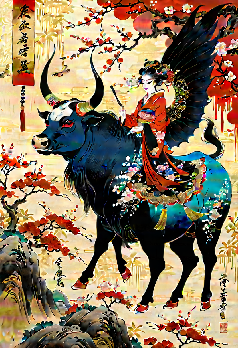 ((masterpiece)),best quality,((illustration)),original,extremely detailed wallpaper,(((beijing opera))),(sketch),((wash painting)),((ink splashing)),((((dyeing)))),((Chinese painting)),((beijing opera))),(sketch),(wash painting),(ink splashing),dyeing,((Chinese painting)),((a mythical ferocious animal)),{{The bull}},{{ long horns}},{{With wings on its back}},(Red and black wings),(solo),mountain,Big and strong,Diabolical,Tyrannical,{{{Ukiyo-e_style}}},{{flat_style}},{simple_colors},{{{masterpiece}}},{katsushika_hokusai},{chinoiserie},{{{best_quality}}},kimono,{{ultra-detailed}},{illustration},{{an_extremely_delicate_and_beautiful}},{Gorgeous and rich graphics},<lora:add-detail-xl:1.5>,<lora:xl_more_art-full_v1:0.3>,