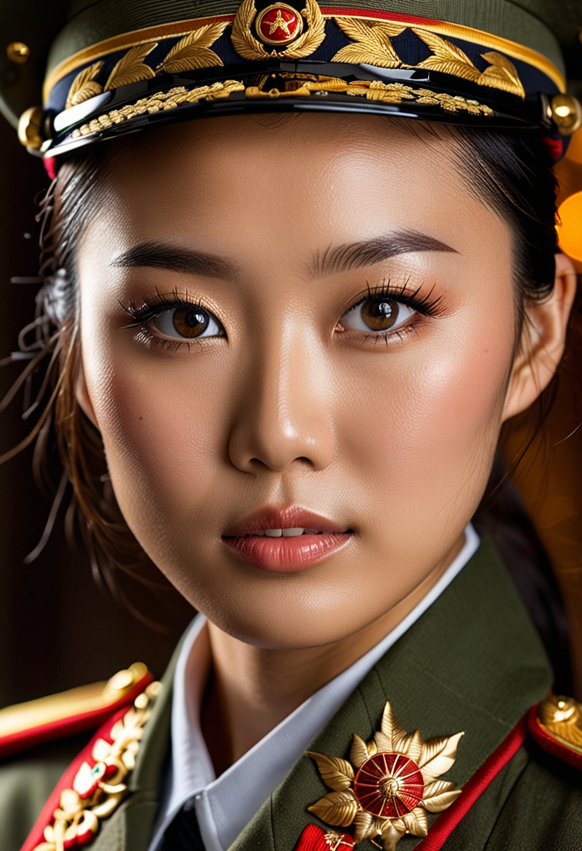<lora:CM-Mix:1>,(A stunning and touching portrait of a young Chinese woman in military uniform, posing sensually, with perfectly round eyes and pupils: 1.2), with her mesmerizing amber eyes as the focus. Capturing the essence of her beauty, emphasizing the intricate details of the scarf pattern and the warmth radiating from her eyes. Achieve exceptional sharpness by pairing the Canon EOS R5 mirrorless camera with a prime RF lens. Optimize settings for shallow depth of field (f/2.8) to beautifully blur the background, allowing the viewer to focus on the girl's striking features. Set ISO to 400 for a balanced exposure, and use a shutter speed of 1/250 second to freeze any subtle movement. Enrich compositions with soft, diffused natural light, highlighting textures and colors to create timeless and culturally rich images