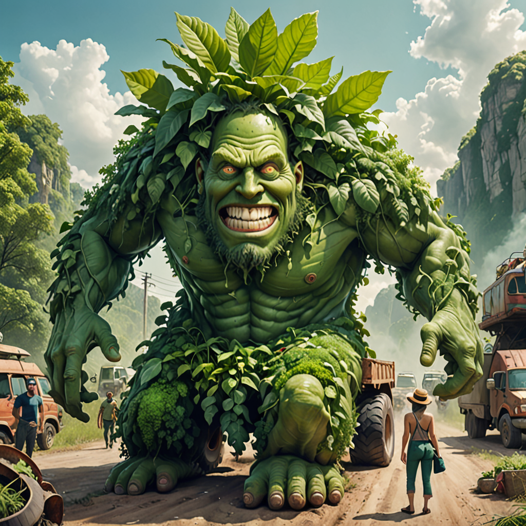 professional high-resolution photograph of 1giant green Cyclops with 2 eyes person made of plants,1woman, smile, 1man, hat, outdoors, multiple men, sky, day, 2men, grin, colored skin, traditional media, parody, ground vehicle, motor vehicle, car, green skin, truck, humongous giant green man standing in background, humongous green plant Cyclops person with 2 eyes