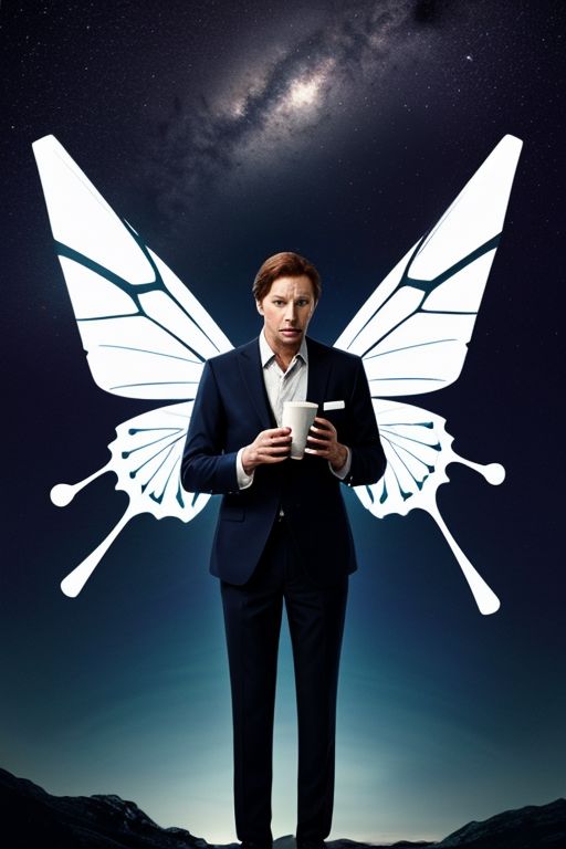 science horror fiction movie, giant butterfly wearing a suit, drinking coffee, pestered by angels