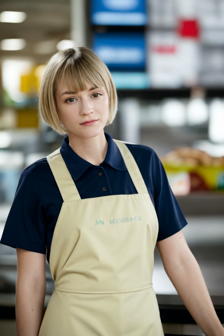 1girl, solo, portrait of a McDonald worker wearing uniform at a counter, pixie cut with bangs, McDonald's, looking at viewer, blurry_background, bokeh, chromatic_aberration, depth_of_field, female focus, photorealistic, soft colors, masterpiece, high quality, (high detailed skin:1.1) <lora:emily_kinney_lora_v02:1> ek84, blonde hair