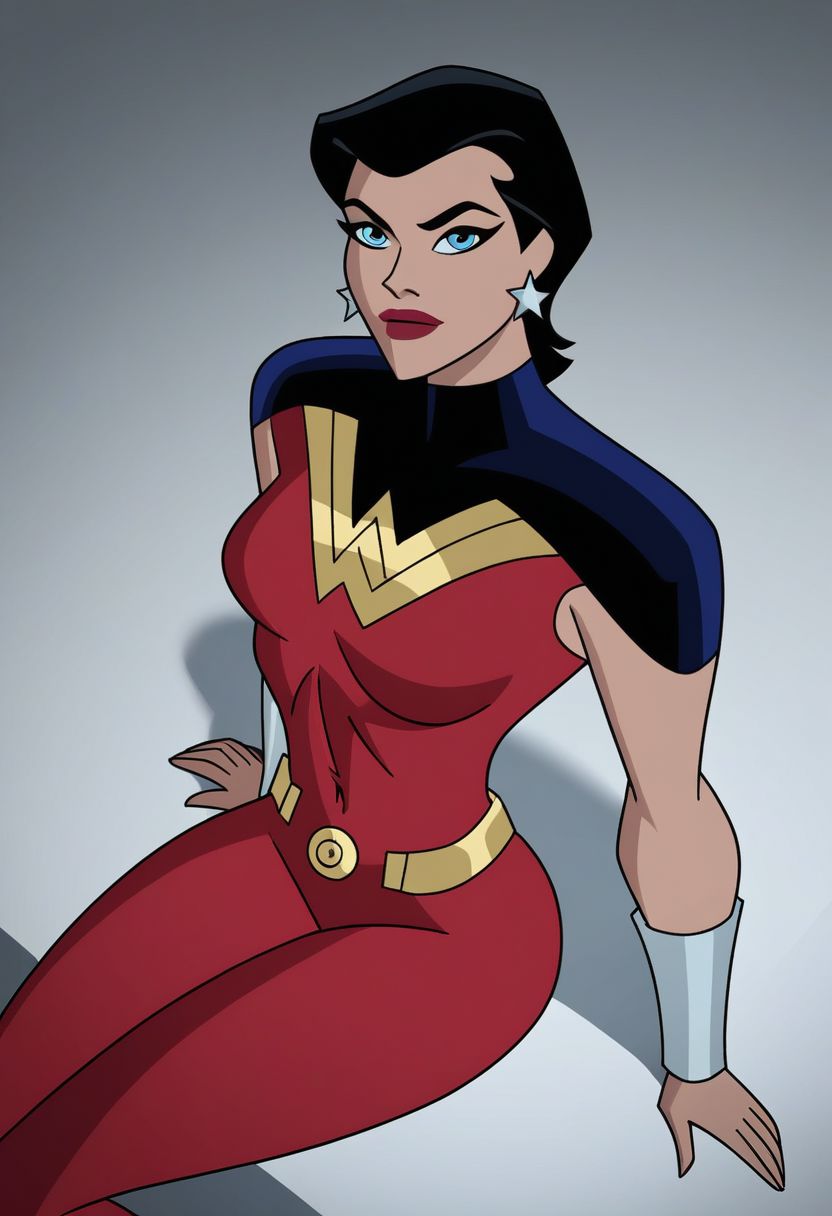 sitting, from above, score_9, score_8_up, score_7_up, score_6_up, BREAK DC_JLU_WonderWoman_JusticeLords_ownwaifu, 1girl, blue eyes, jewelry, black hair, short hair, breasts, lipstick, makeup, red lips, star (symbol), belt, bracer, red bodysuit, wristband, star earrings, toned,