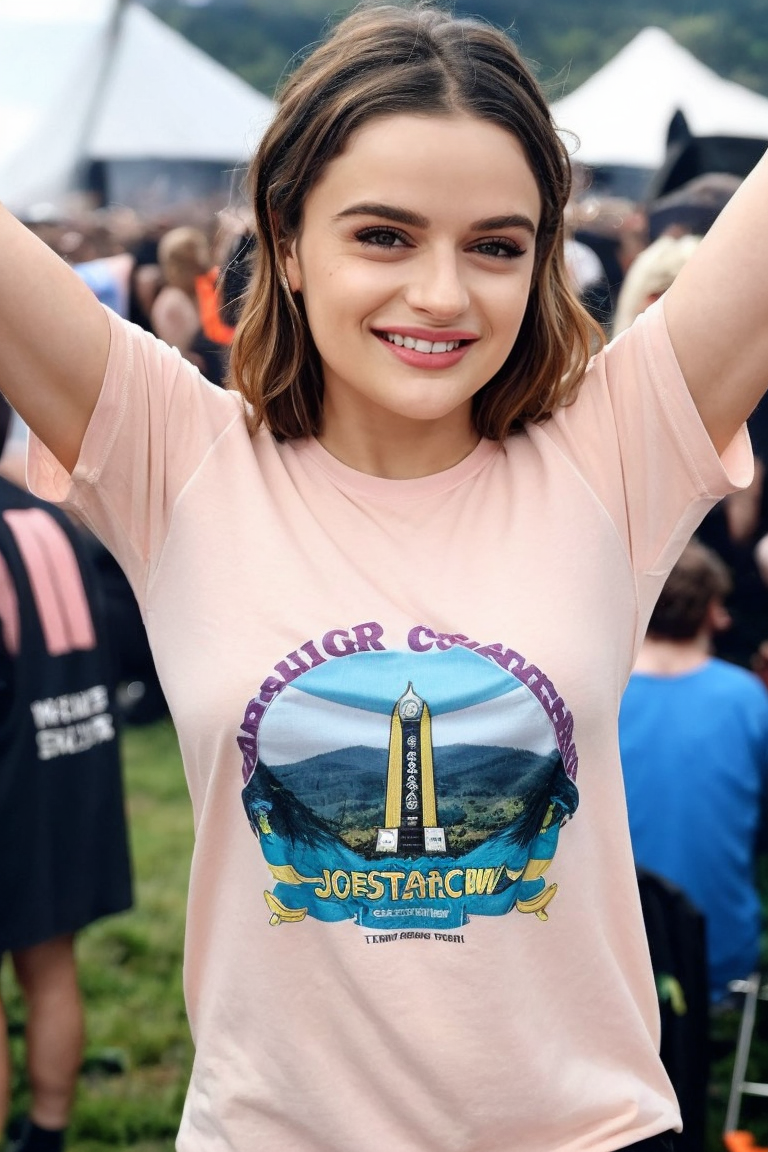 1girl, solo, face, portrait of a fan girl in t-shirt, at Glastonbury concert, raise up arms, grin, female focus, photorealistic, soft colors, masterpiece, high quality, (high detailed skin:1.1) <lora:joey_king_lora_v01:1> joey99