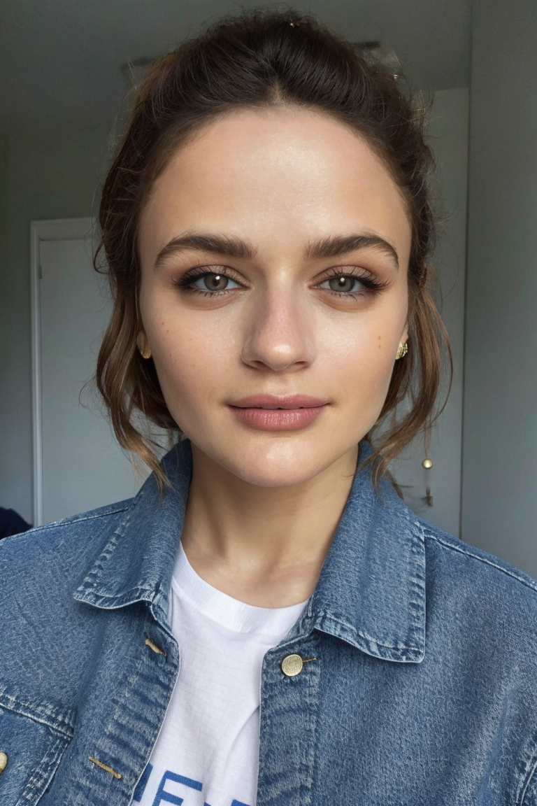 1girl, solo, portrait, close shot, denim jacket, smirk, female focus, photorealistic, soft colors, masterpiece, high quality, (high detailed skin:1.1) <lora:joey_king_lora_v01:1> joey99