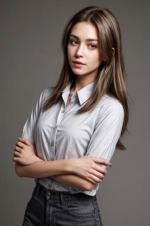 epiCNegative, A portrait of a young woman with windswept, medium-length brown hair with natural highlights. Her eyes should appear piercing and direct, engaging the viewer, while her lips are slightly parted in an approachable expression. She wears a red, collared shirt that is unbuttoned at the top, portraying a sense of casual elegance. The overall mood is relaxed and natural, with a neutral gray background to contrast the rich red of her shirt and highlight her fair complexion."