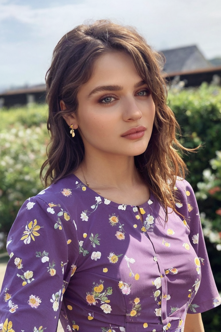 1girl, solo, portrait, face, short-sleeve purple floral sundress, female focus, photorealistic, soft colors, masterpiece, high quality, (high detailed skin:1.1) <lora:joey_king_lora_v01:1> joey99