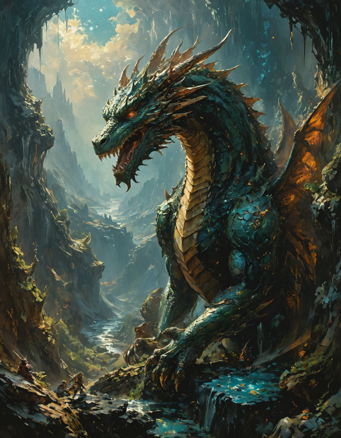 ([by John Berkey|by Ivan Albright]:1.5), (In the midst of the vast expanse of the earth, the majestic dragons rule over their domain, their scales gleaming in the sunlight as they watch over the hoards of richly amassed within their mountain lairs. Each beat of their wings sends tremors through the earth, a reminder of their unmatched power and unyielding resolve to protect their precious treasures from would-be intruders. The bravest of adventurers, pause in awe, contemplating the fate of nature itself, as the dragons face the danger with an intense determination.:0.5) (Cosmic fantasy:1.3) <lora:xl_more_art-full_v1:0.5> <lora:add-detail-xl:0.7> <lora:MJ52:0.4>