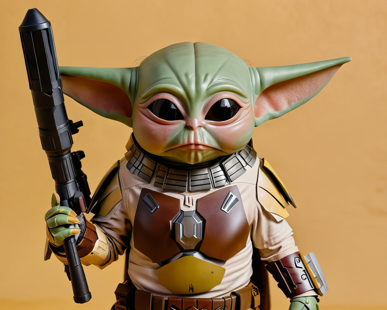 <lora:mandalorian_SDXL:0.9> mandalorian<lora:Grogu:0.8> Grogu wearing his mandalorian armor posing for the camera
