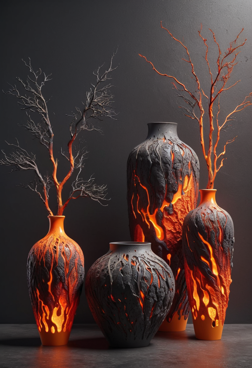 (different:1.5) tall vases and pots in lava style, dry branches, on the podium, ral-lava, High detailed RAW color Photo, 8k, ultra detailed <lora:ral-lava-sdxl-v2:0.6>