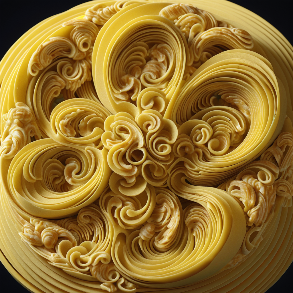 Redesign of a Pasta in an art deco style, opulent and extravagant, geometric forms, curvilinear forms, bold colors, design and setting should represent style of Libellus Novus design, <lora:Libellus_Novus_XL:1>, 8k uhd, ultra-sharp focus, award winning