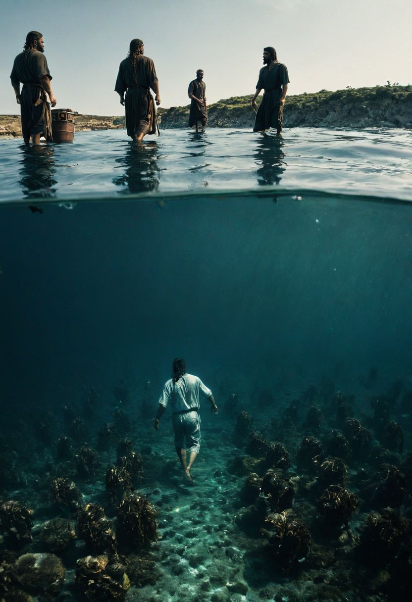 Split Diopter style, Capture the miraculous moment: Jesus walks on water, with disciples beneath the surface supporting his steps. Show the profound faith and unity between teacher and followers, as they navigate the depths of belief and the surface of the unknown., deep blacks, high contrast, atmospheric haze, Film grain, cinematic film still, shallow depth of field, highly detailed, moody, epic, OverallDetail, 2000s vintage RAW photo, photorealistic, candid camera, color graded cinematic, atmospheric lighting, imperfections, natural, shallow dof