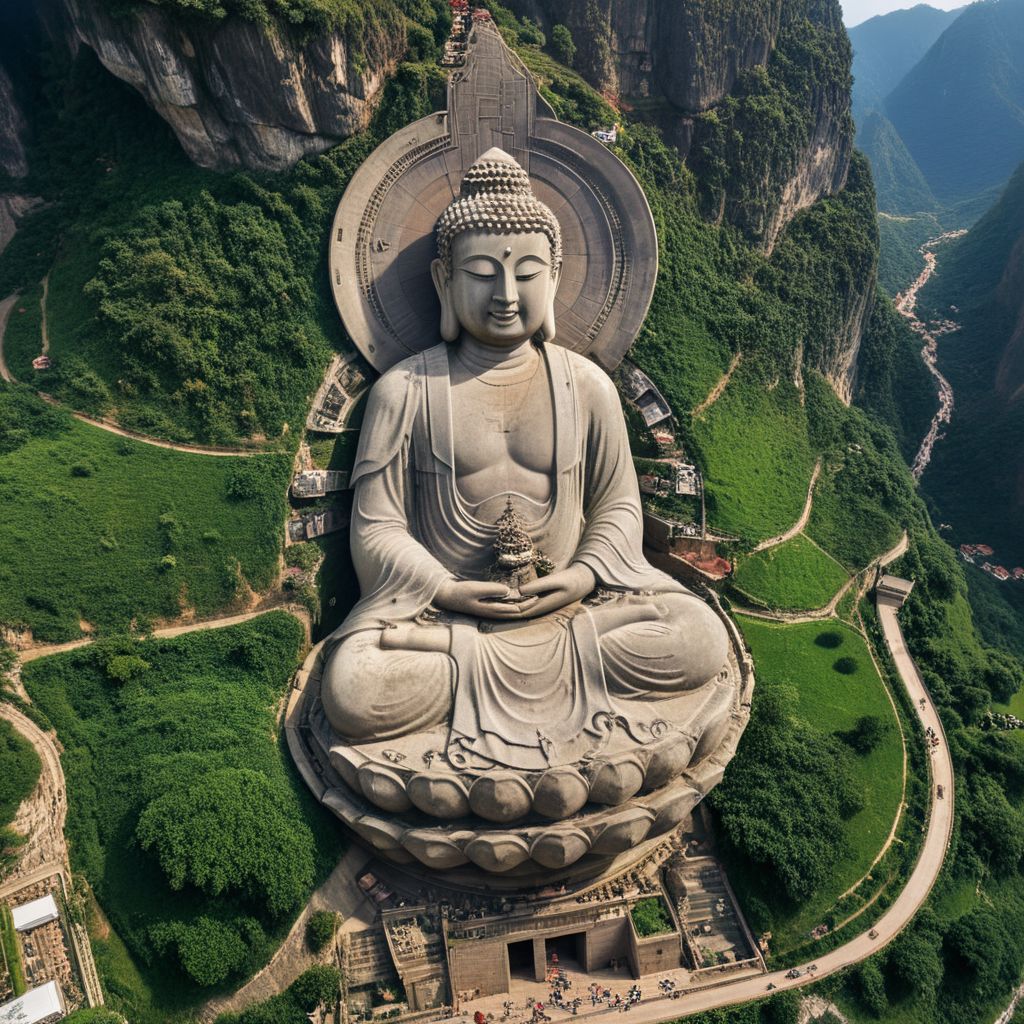 post modern:1.5, (Huge jaint lying down metal Buddha After sleeping for three thousand years, it emerged from the cliff, In the African wilderness, wild animals were alarmed:1.4), (Ancient megalithic civilization, Azka Lines, on Easter Island, Angkor Wat:1.2), (The colonial city of the future, in the mist-filled Grand Canyon, on an unknown Earth-like planet, 2 moon on sky, Spaceship flight connects colonies, waterfulls:1.3), (Machu Picchu, a mountain settlement, incredibly spectacular:1.2), (Mario Botta:1.3), (avant-garde, future, reality, science fiction, photorealistic), (modern architecture:1.2), White limestone with black granite, fountain, waterfall, landmark, square, path, narrow street, (Large Files, Ultra Realistic, 8K, 16k, FHD, HD, VFX, Perfect, Photography, composition, Architecture Sales Photography, Architecture Competition, Ultra High Resolution, Cinematography, High Resolution Image:1.1), (dramatic lighting, direct sunlight, ray tracing, clear shadow:1.2), (real landscape:1.1), (blurred background:1.0), (urban background, more_details) , great lighting, extremely detailed, clear, Buddha Statue, GuanYin Statue, DiZang Statue, industrialbuilding