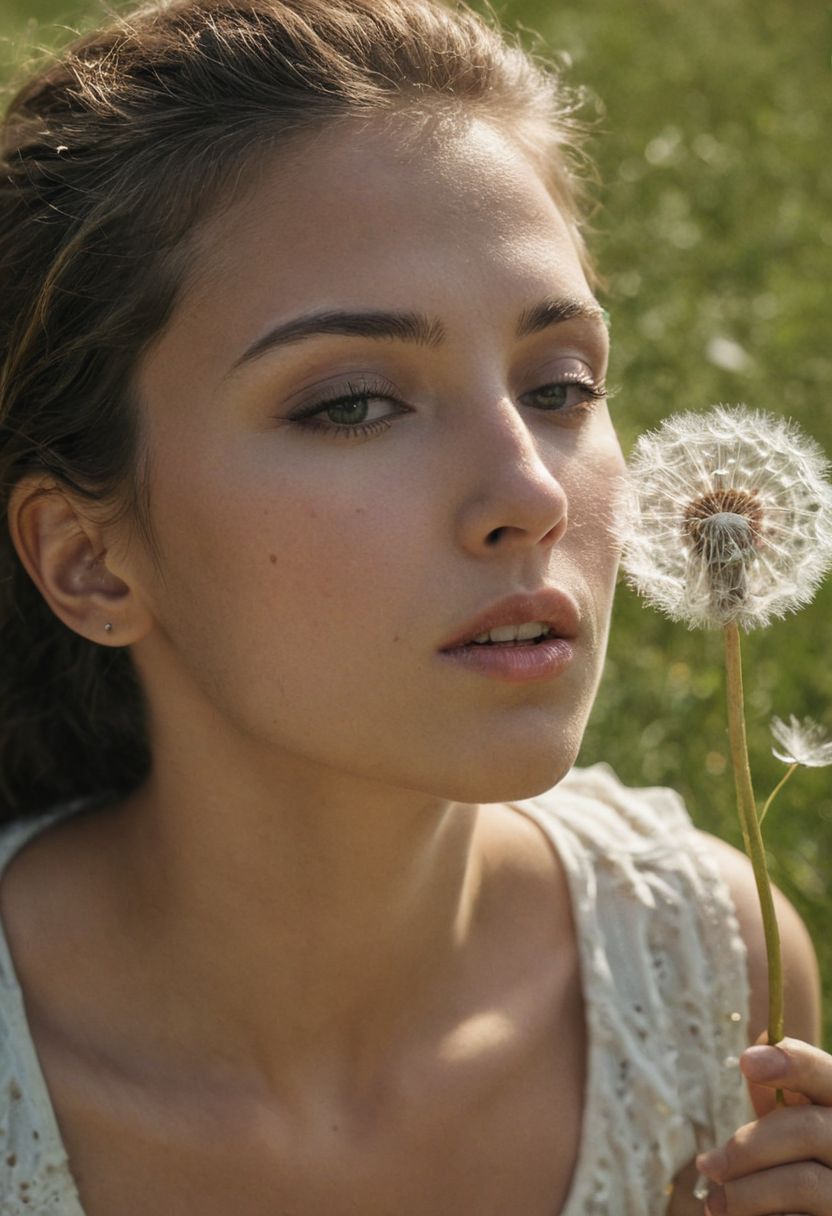 Aerial View, amazing quality, masterpiece, best quality, hyper detailed, ultra detailed, UHD, perfect anatomy, portrait, dof, hyper-realism, majestic, awesome, inspiring, the Karma goddess, blowing a dandelion to viewer, cinematic composition, soft shadows, national geographic style