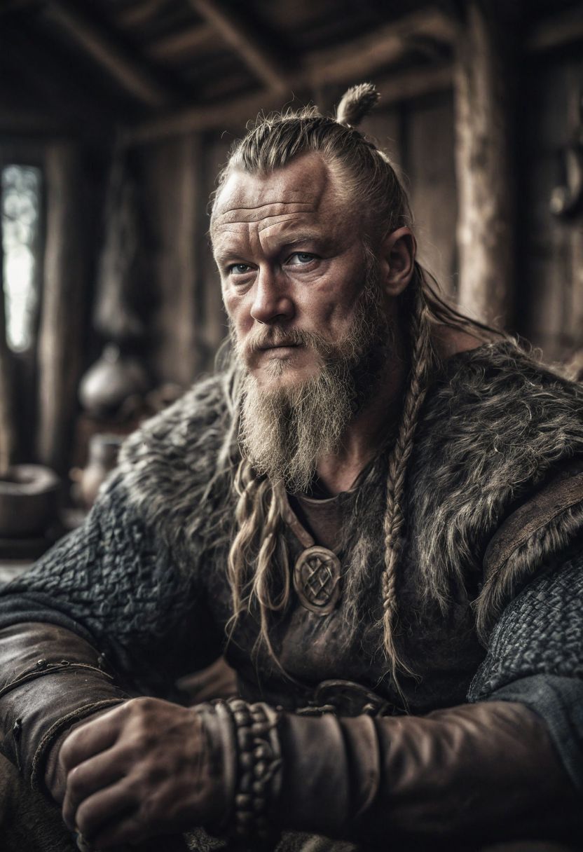 closeup of old Ragnar Lothbrok sitting in a typical viking hut, desaturated background, bokeh, dark theme, soothing tones, depth of field, dramatic backlighting, film grain,
