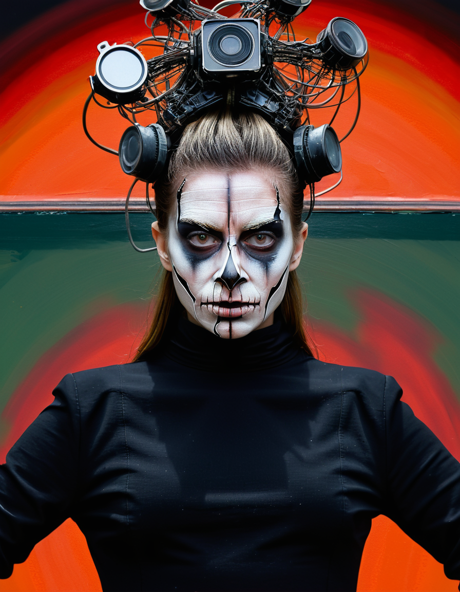 medium shot, portrait painting , dystopian surrealism, deathly fantastical Nightmare ,Fusion of Nature and Technology, nightmarish, facing camera, (ohwx:1.1) woman, dynamic background, in a "Francis Bacon" style painting <lora:CassidyKlein_SDXL_v1.0:.95>