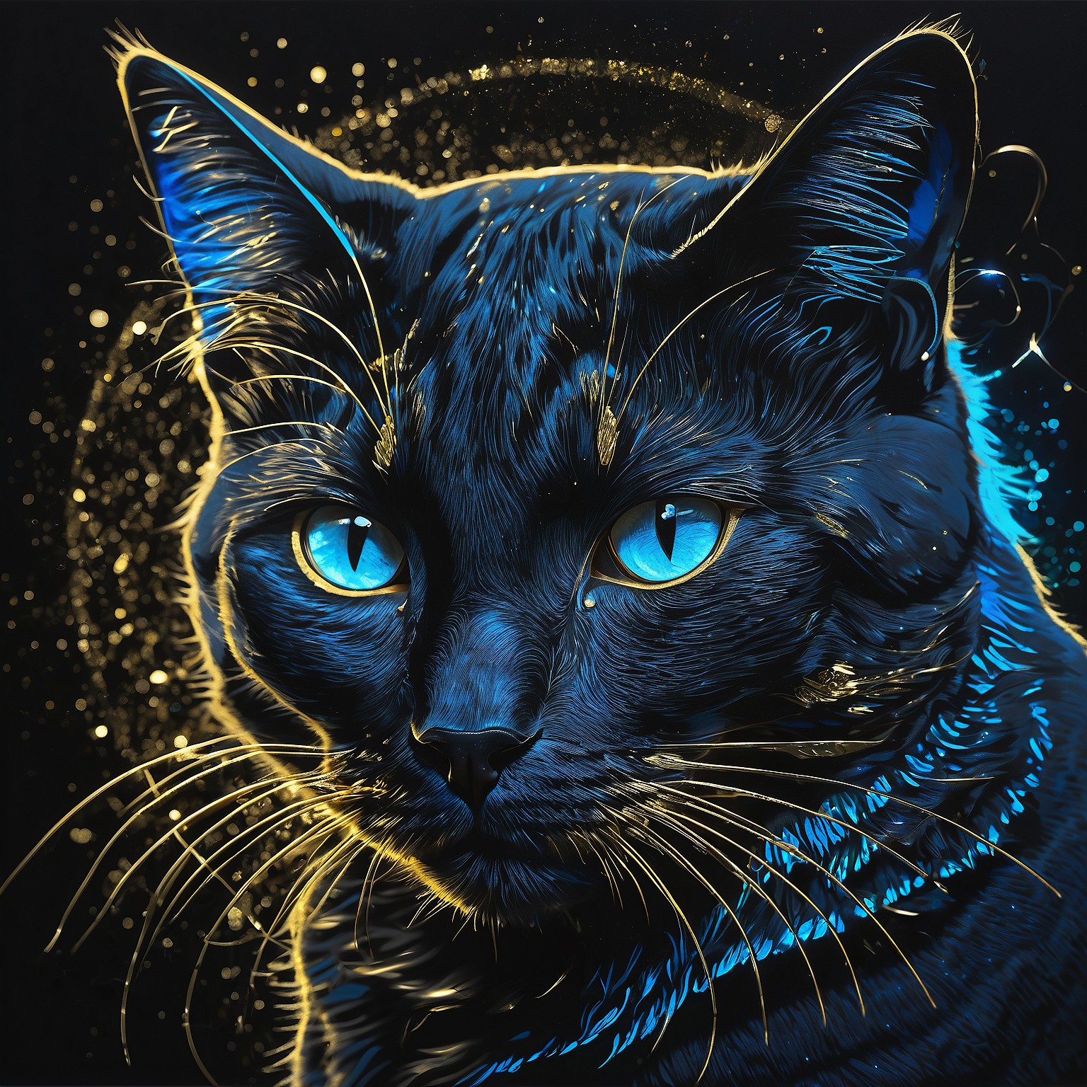 A cat in a chiaroscuro setting with neon blue accents, featuring gold glitter elements, and an added layer of shadow