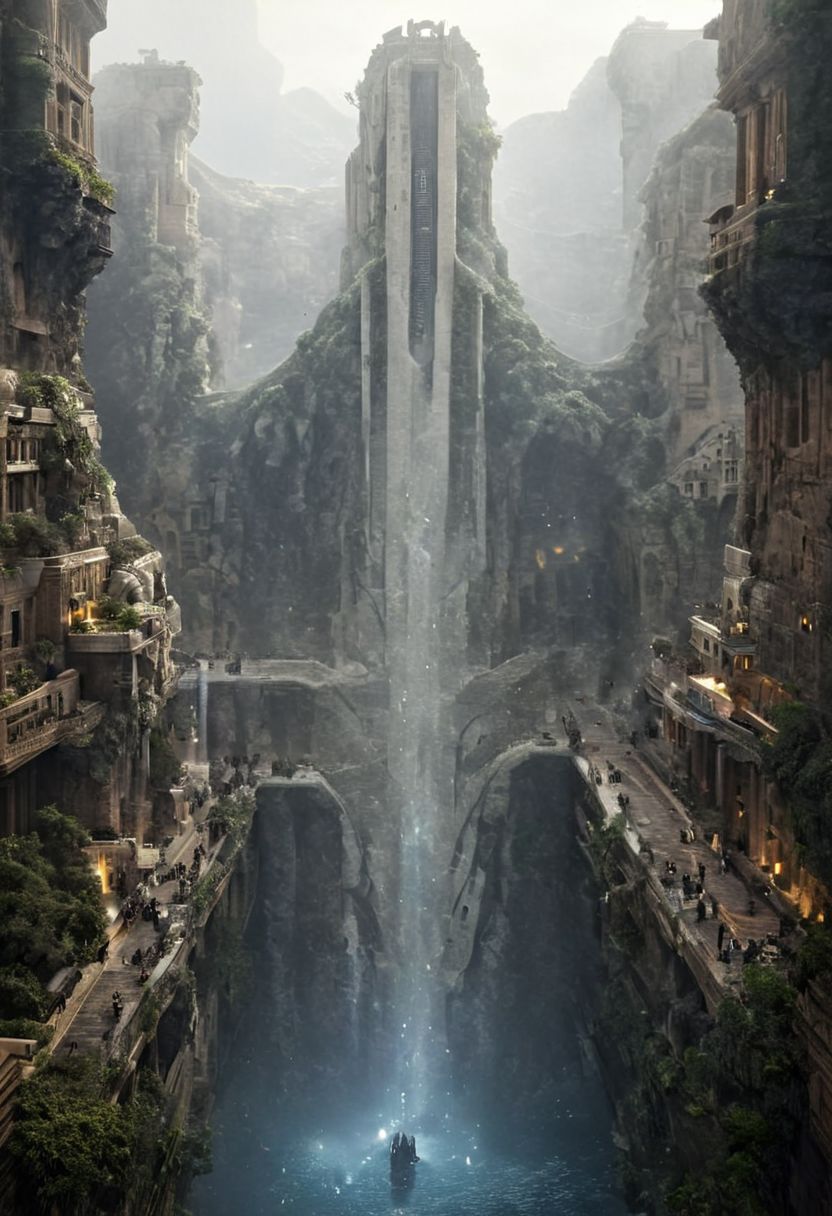 POV view , DOF, (Ancient civilization, Alien Prometheus movie scene, dune movie scene:1.5), (The colonial city of the future, in the mist-filled Grand Canyon, on an unknown Earth-like planet, 2 moon on sky, Spaceship flight connects colonies, waterfulls:1.3), (Machu Picchu, a mountain settlement, incredibly spectacular:1.2), (Mario Botta:1.3), (avant-garde, future, reality, science fiction, photorealistic), (modern architecture:1.2), White limestone with black granite, fountain, waterfall, landmark, square, path, narrow street, (Large Files, Ultra Realistic, 8K, 16k, FHD, HD, VFX, Perfect, Photography, composition, Architecture Sales Photography, Architecture Competition, Ultra High Resolution, Cinematography, High Resolution Image:1.1), (dramatic lighting, direct sunlight, ray tracing, clear shadow:1.2), (real landscape:1.1), (blurred background:1.0), (urban background, more_details) , great lighting, clear, hillscastel, <stardeaf-cold-arc>, xtower, industrialbuilding