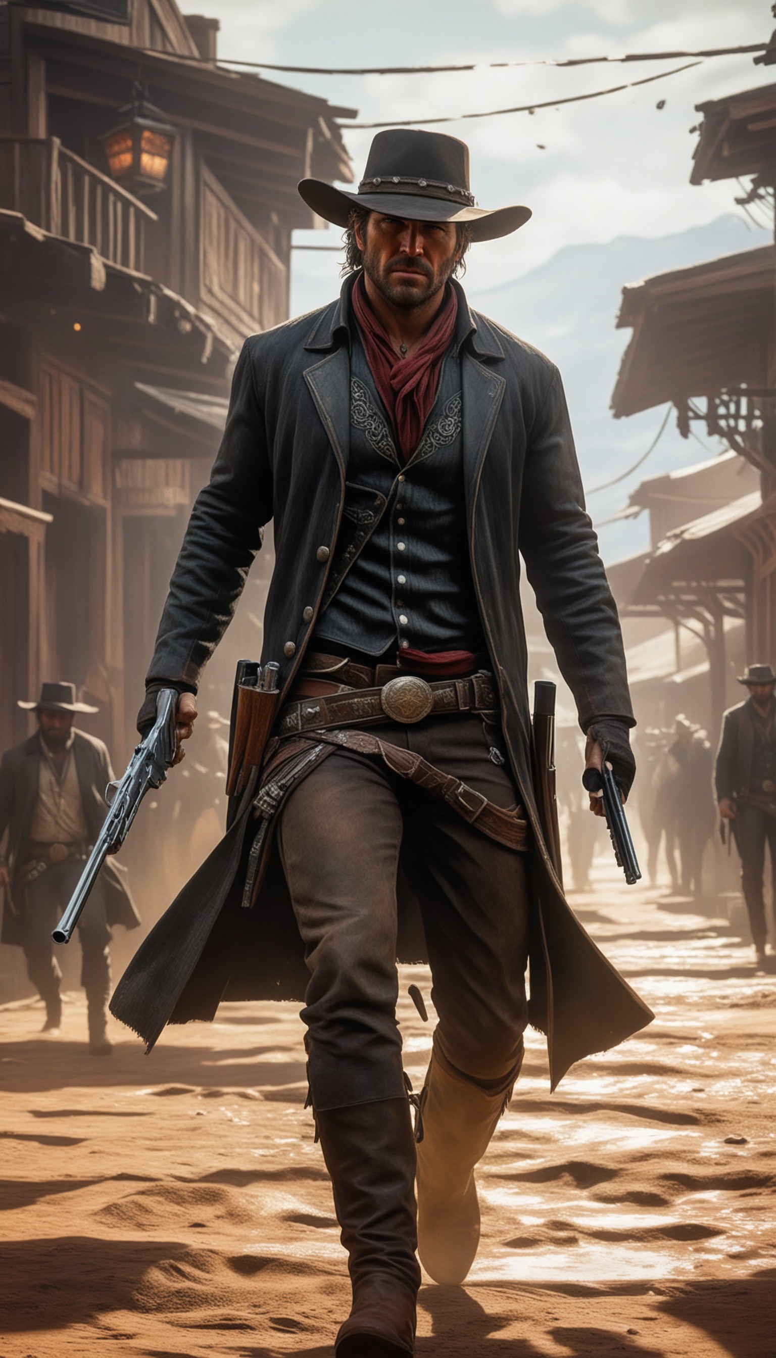 Intricate dynamic action shot of cowboy in a shootout, cinematic Steve Henderson Fabian Perez Henry Asencio Jeremy Mann Marc Simonetti Fantasy, red dead redemption 2 atmosphere, cinematic, photograph