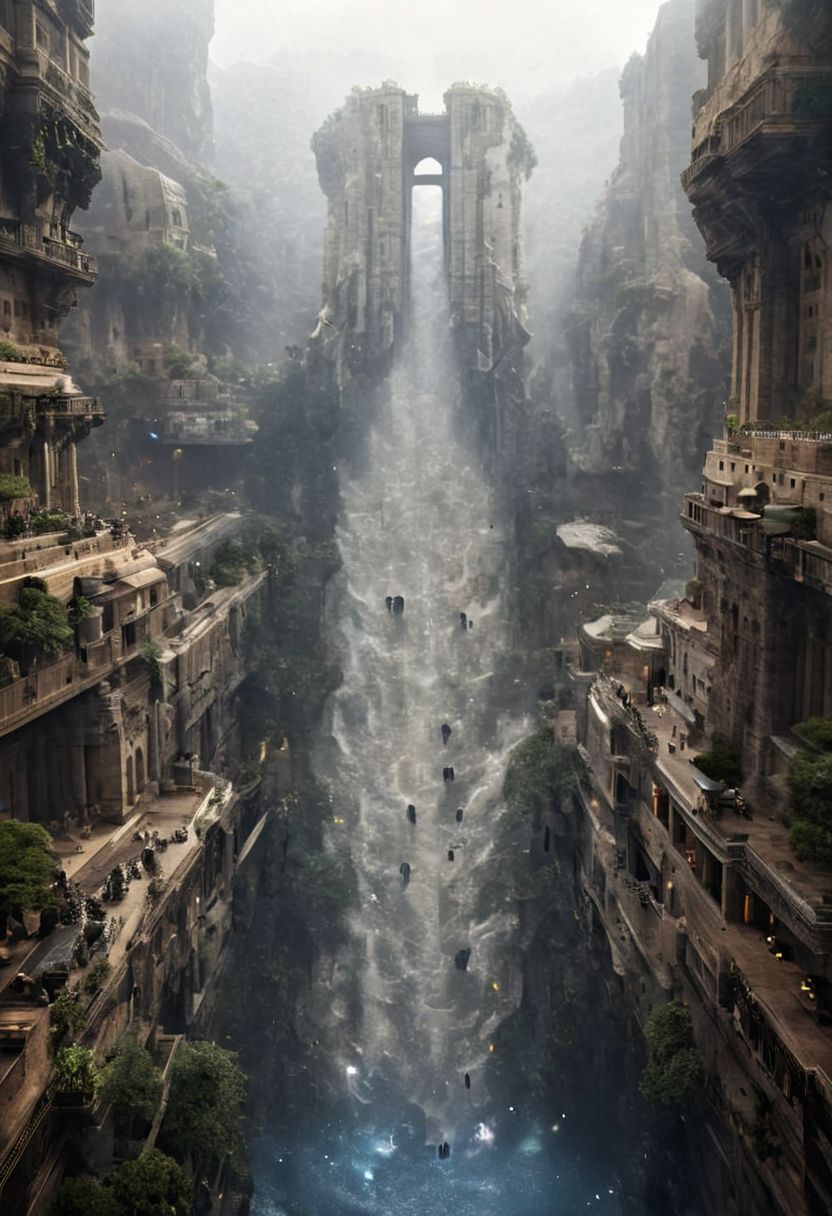 POV view , DOF, (Ancient civilization, Alien Prometheus movie scene, dune movie scene:1.5), (The colonial city of the future, in the mist-filled Grand Canyon, on an unknown Earth-like planet, 2 moon on sky, Spaceship flight connects colonies, waterfulls:1.3), (Machu Picchu, a mountain settlement, incredibly spectacular:1.2), (Mario Botta:1.3), (avant-garde, future, reality, science fiction, photorealistic), (modern architecture:1.2), White limestone with black granite, fountain, waterfall, landmark, square, path, narrow street, (Large Files, Ultra Realistic, 8K, 16k, FHD, HD, VFX, Perfect, Photography, composition, Architecture Sales Photography, Architecture Competition, Ultra High Resolution, Cinematography, High Resolution Image:1.1), (dramatic lighting, direct sunlight, ray tracing, clear shadow:1.2), (real landscape:1.1), (blurred background:1.0), (urban background, more_details) , great lighting, clear, hillscastel, <stardeaf-cold-arc>, xtower, industrialbuilding