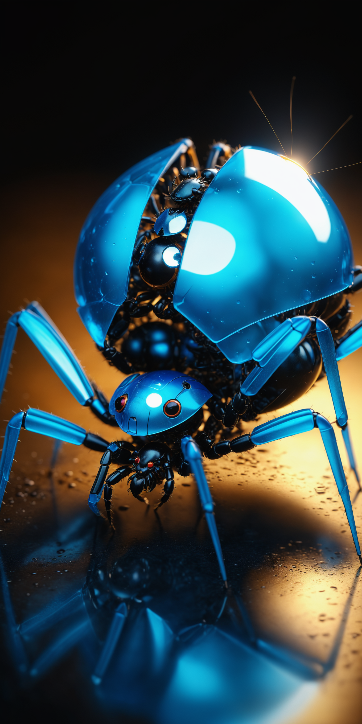 Mechanical robotic cute realistic bright blue insect (Spider with a spherical abdomen that is sleek and shiny. Hourglass shaped, the abdomen is larger than its head and thorax, which are fused together. Like a small, plump black ball connected to a smaller, black head) with many small and large eyes standing in background complete black, unsettling, wide angle, nighttime, subsurface scattering, ultra hd, 4k, high def, Photorealistic, Hyperrealistic, Hyper detailed, analog style, realistic, masterpiece, best quality, ultra realistic, 8k, Intricate, High Detail, film photography, soft lighting, heavy shadow <lora:epi_noiseoffset2:1>, <lora:add_detail:0.8>, <lora:add-detail-xl:1> <lora:xl_more_art-full_v1:0.5> <lora:KK_paperCut_v1:1>, paper_cut, (fractal art: 1.4)