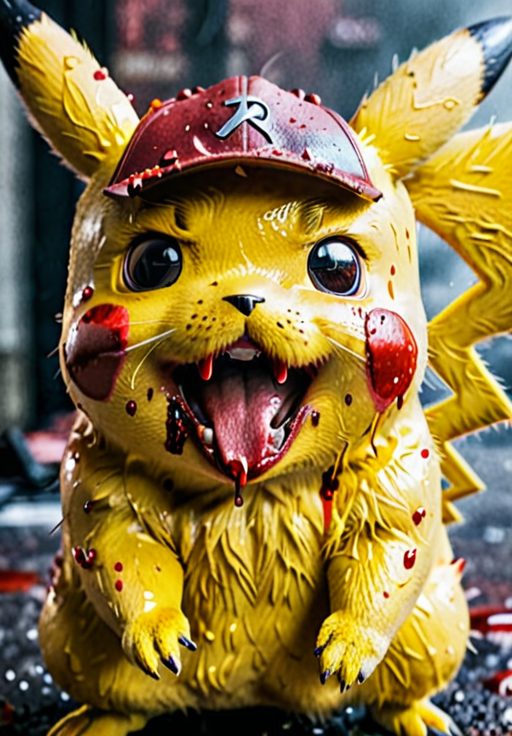 RAW photo of sweaty Pikachu as a real character,blood,(dystopian movie:1.22),film grain,sweaty face,extreme detailed face,angry, sharp teeth,as gore movie,gruesome:1.0
