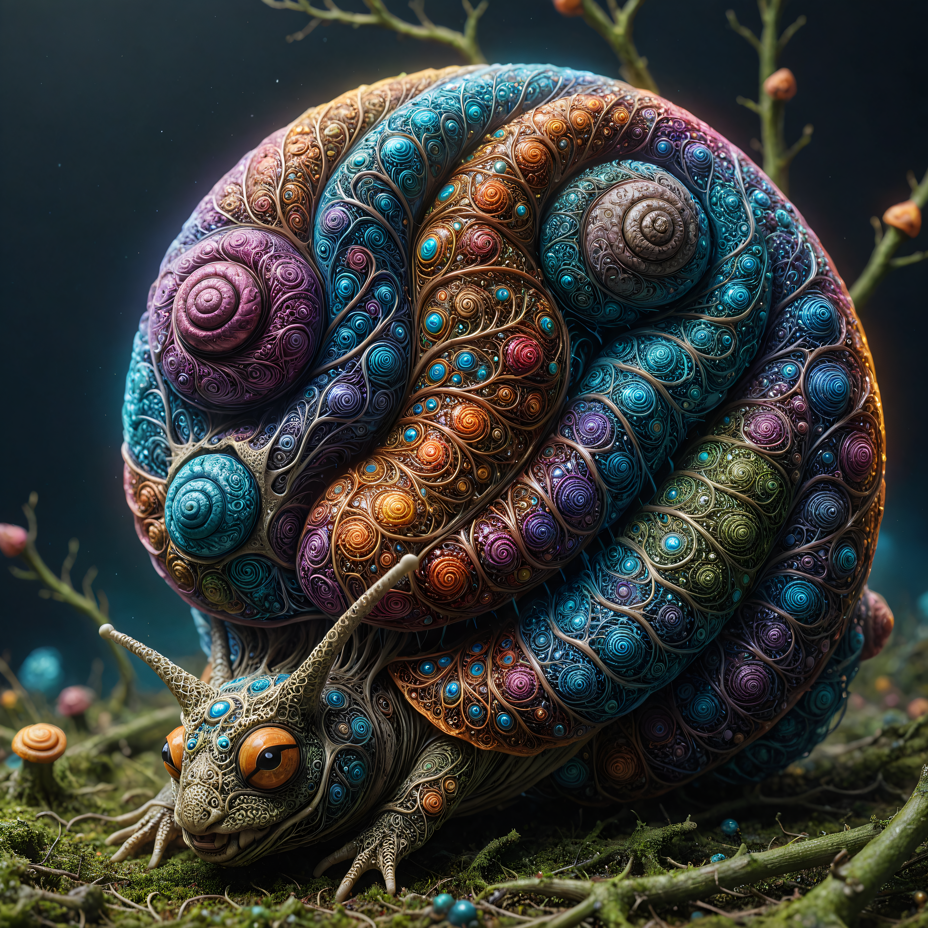 fantasy glowing colorful snail spiral, blinking, highly detailed, photorealistic, complex structure, many details, (fantasy glowing moss) <lora:SDXL\ral-braynclz-sdxl>