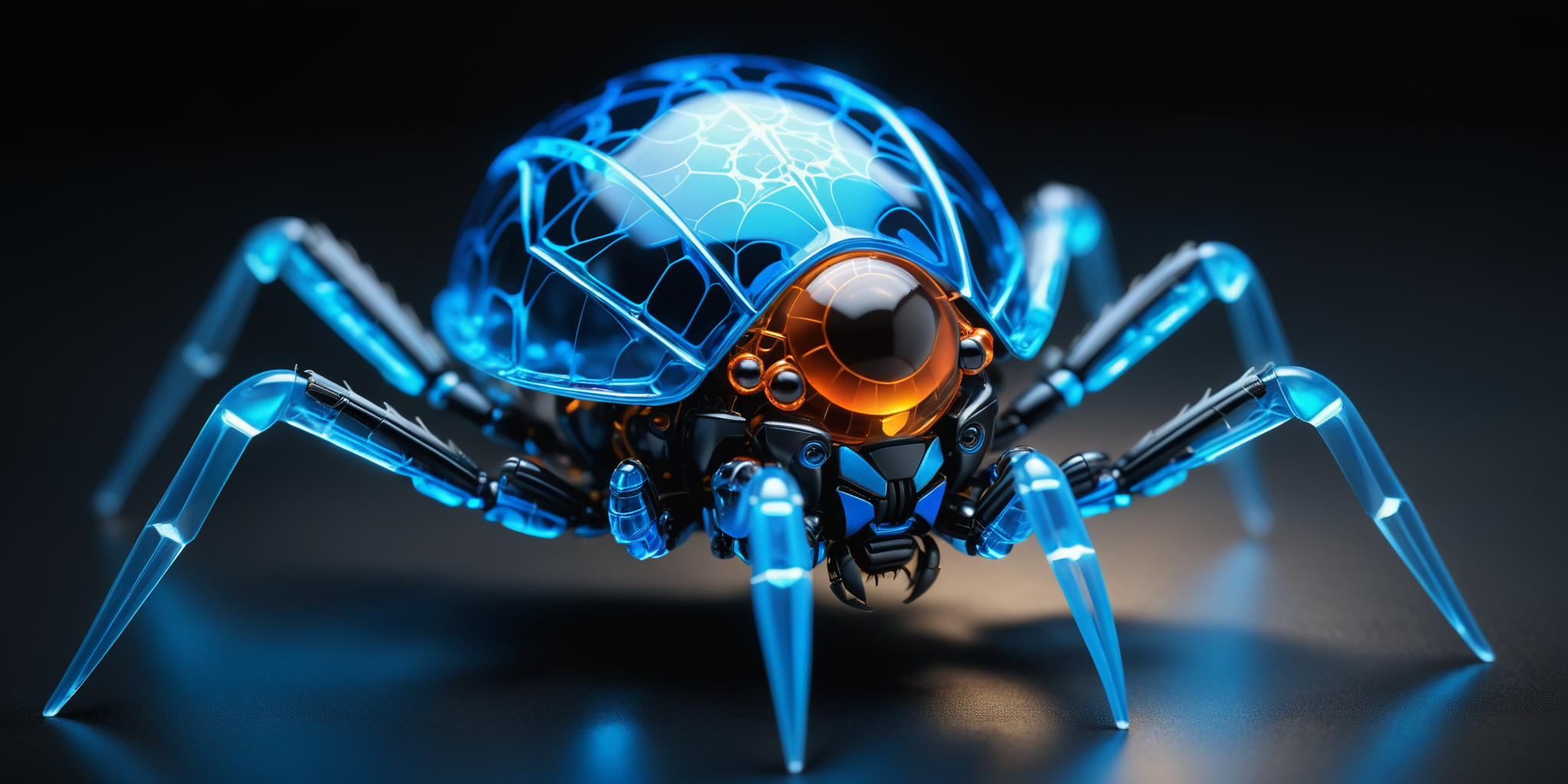 Mechanical robotic cute realistic bright blue insect (Spider with a spherical abdomen that is sleek and shiny. Hourglass shaped, the abdomen is larger than its head and thorax, which are fused together. Like a small, plump black ball connected to a smaller, black head) with many small and large eyes standing in background complete black, unsettling, wide angle, nighttime, subsurface scattering, ultra hd, 4k, high def, Photorealistic, Hyperrealistic, Hyper detailed, analog style, realistic, masterpiece, best quality, ultra realistic, 8k, Intricate, High Detail, film photography, soft lighting, heavy shadow <lora:epi_noiseoffset2:1>, <lora:add_detail:0.8>, <lora:add-detail-xl:1> <lora:xl_more_art-full_v1:0.5> <lora:KK_paperCut_v1:1>, paper_cut, (fractal art: 1.4)