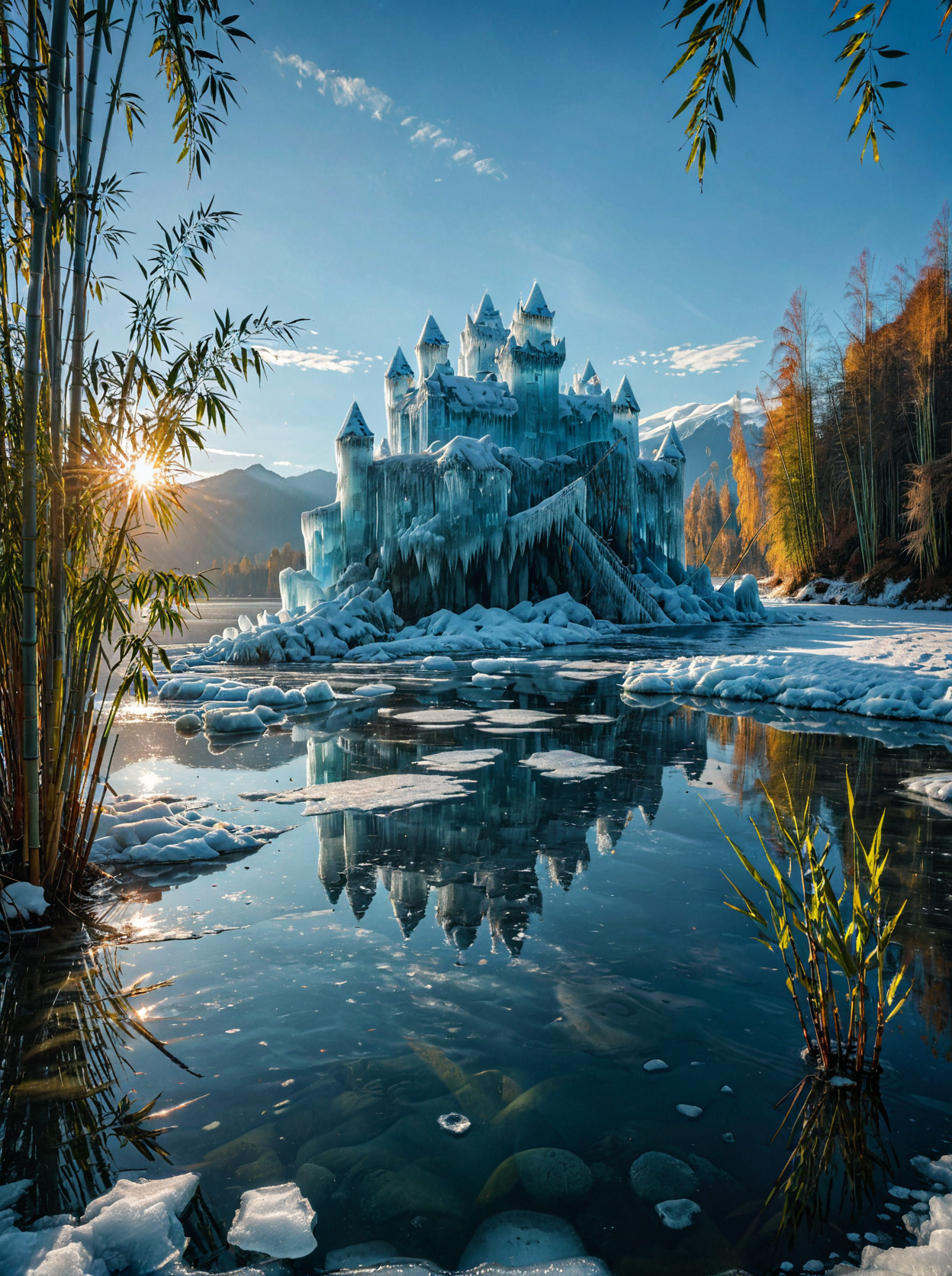 Breathtaking photography. A majestic ice castle. At midday with bright, harsh sunlight. A cluster of tall, swaying bamboo in foreground. Large, tranquil lake reflecting the sky in background. Award-winning, professional, highly detailed. <lora:MJ52:0.5> <lora:RMSDXL_Darkness_Cinema:1> (HDR (High Dynamic Range), vibrant colors, high contrast, detailed, UltraHD, 8K, cinematic, 80mm, high detail)