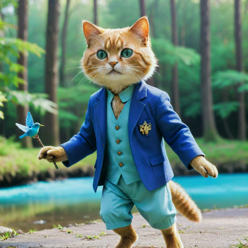 anime key visual, dense lake and trees, stylized, medium close-up shot of a flyweight Priest (cat pretending to be a human:1.3) , he is riding a Hummingbird, he has a very light smile, dressed in Distinctive Blue Cobalt Blue and Chartreuse standing upright and wearing human clothing from the 2020's, his hair is Russian and styled as Short and messy, he has a Familiar Punks Turquoise Patches, Giant Soul Patch, at Dawn, tilt shift, (by Jean Renoir:1.3) , (Darren Aronofsky:0.8) , (Hirokazu Kore-Eda:0.9) , Masterpiece, Romantic, Yume Kawaii, key light, Low shutter, Technicolor, Amber dust particles, Beige mist, charming Emerald Green eyes, pale skin, artstation, Highres
