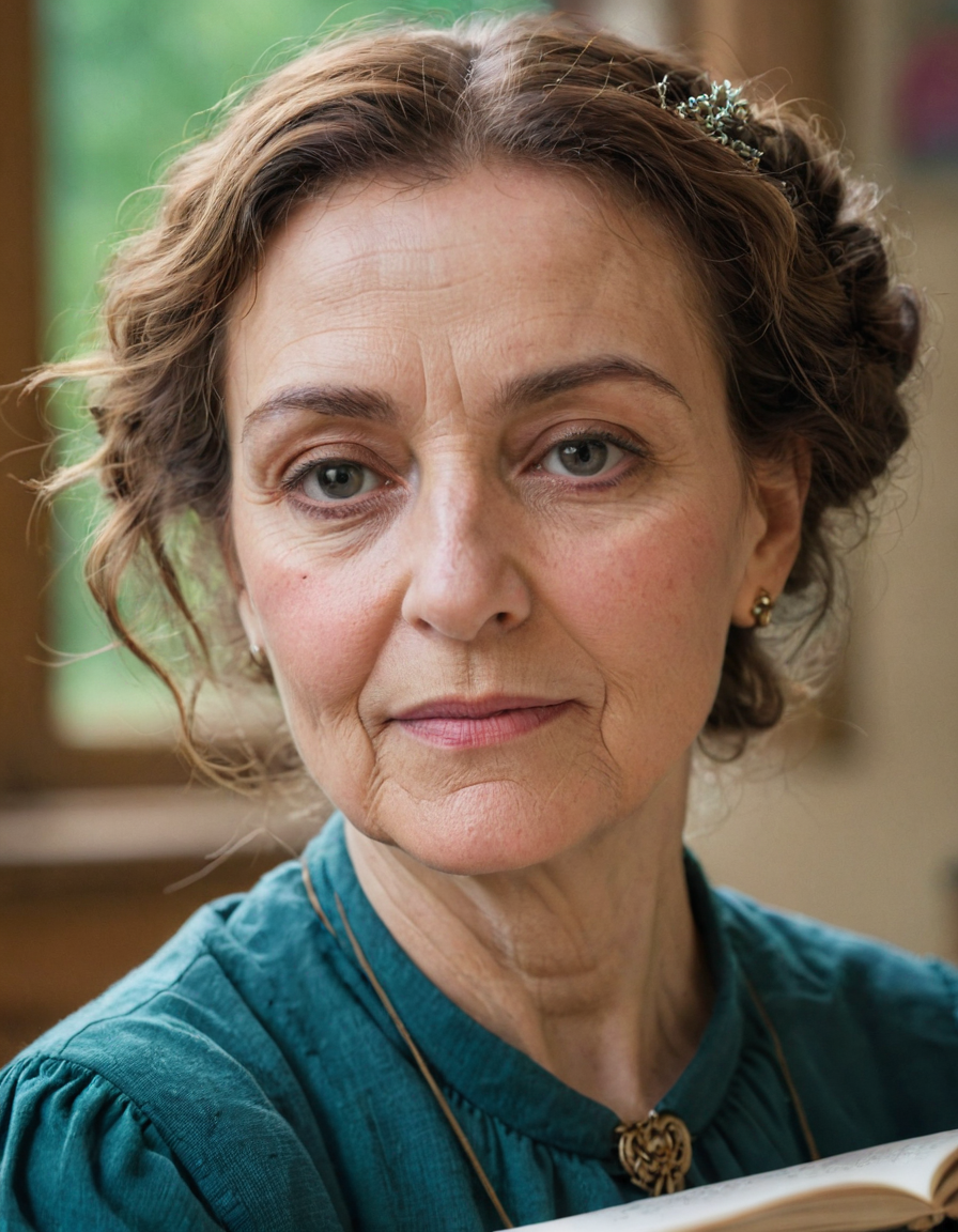 98 y.o. strong Teacher Lial, Bokeh, stylized by John Everett Millais, Camilla d'Errico and Enki Bilal, Cozy, Phase One XF IQ4 150MP, F/2.8, close-up