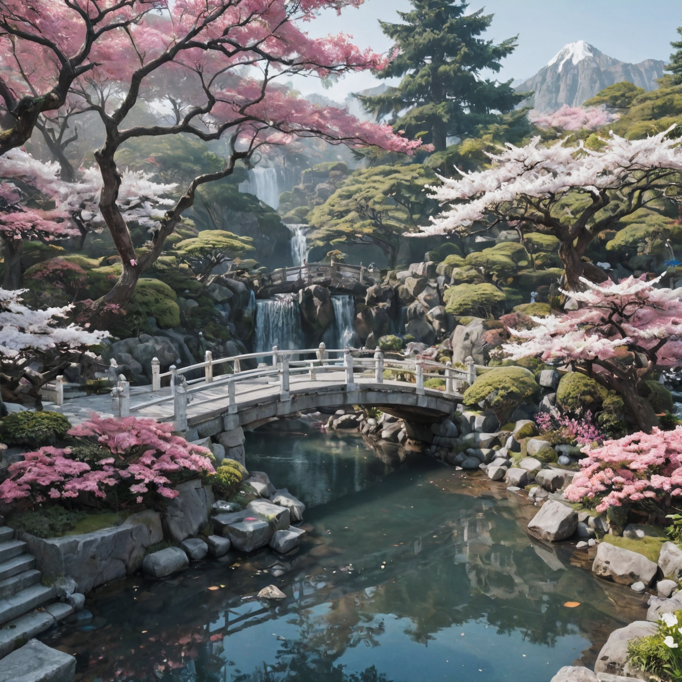 long range view, Beautiful Japanese flower garden, elegant bridges, waterfalls, pink and white, by Akihito Yoshida, Ismail Inceoglu, Karol Bak, Airbrush, Dramatic, Panorama, Cool Color Palette, Megapixel, Lumen Reflections, insanely detailed and intricate, hypermaximalist, elegant, ornate, hyper realistic, super detailed, unreal engine