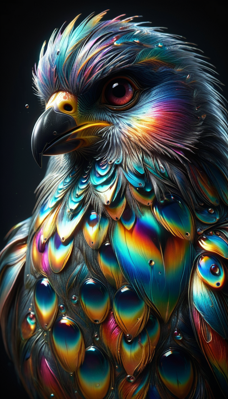 penguin with feathers made out of <lora:ral-oilspill:1> ral-oilspill, subsurface scattering, ultra hd, 4k, high def, Photorealistic, Hyperrealistic, Hyper detailed, analog style, realistic, masterpiece, best quality, ultra realistic, 8k, Intricate, High Detail, film photography, soft lighting, heavy shadow
