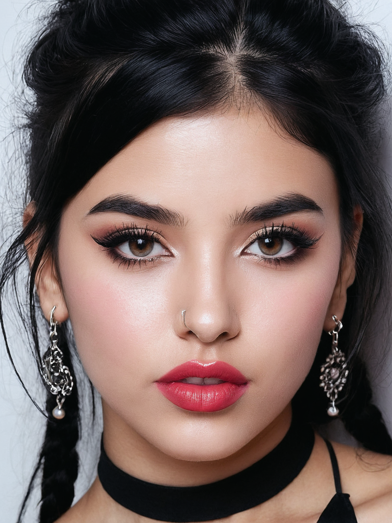 1girl, detailed eyes, biting own lips, lip piecring, nose piercing, nose ring, chocker, cleavage, black hair, blushing,, ,BREAK, hyperdetailed photography, soft light, head and shoulders portrait, cover, high resolution
